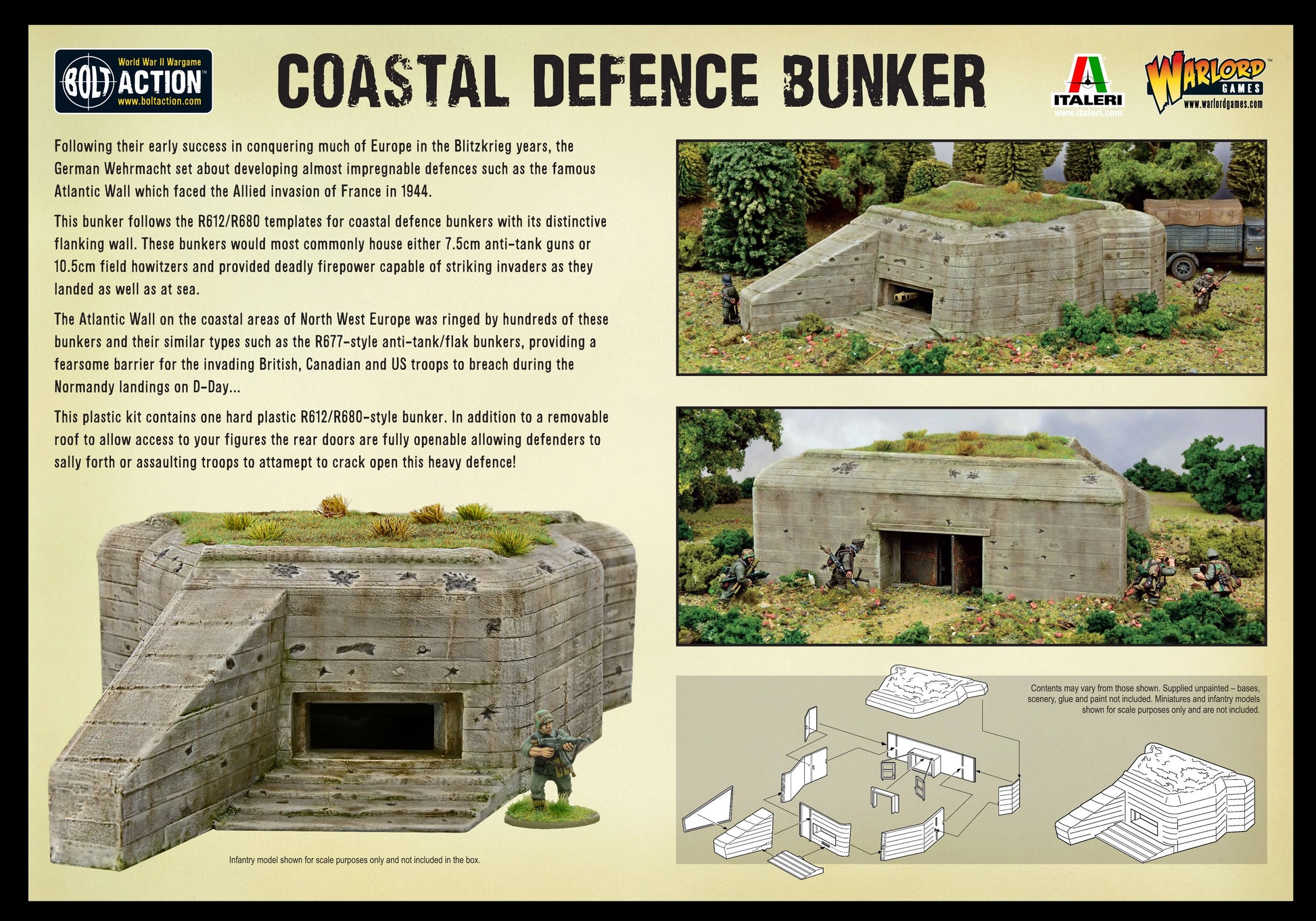 This plastic kit contains one hard plastic R612/R680-style bunker. In addition to a removable roof to allow access to your figures, the rear doors are fully openable allowing defenders to sally forth or assaulting troops to attempt to crack open this heavy defence!
