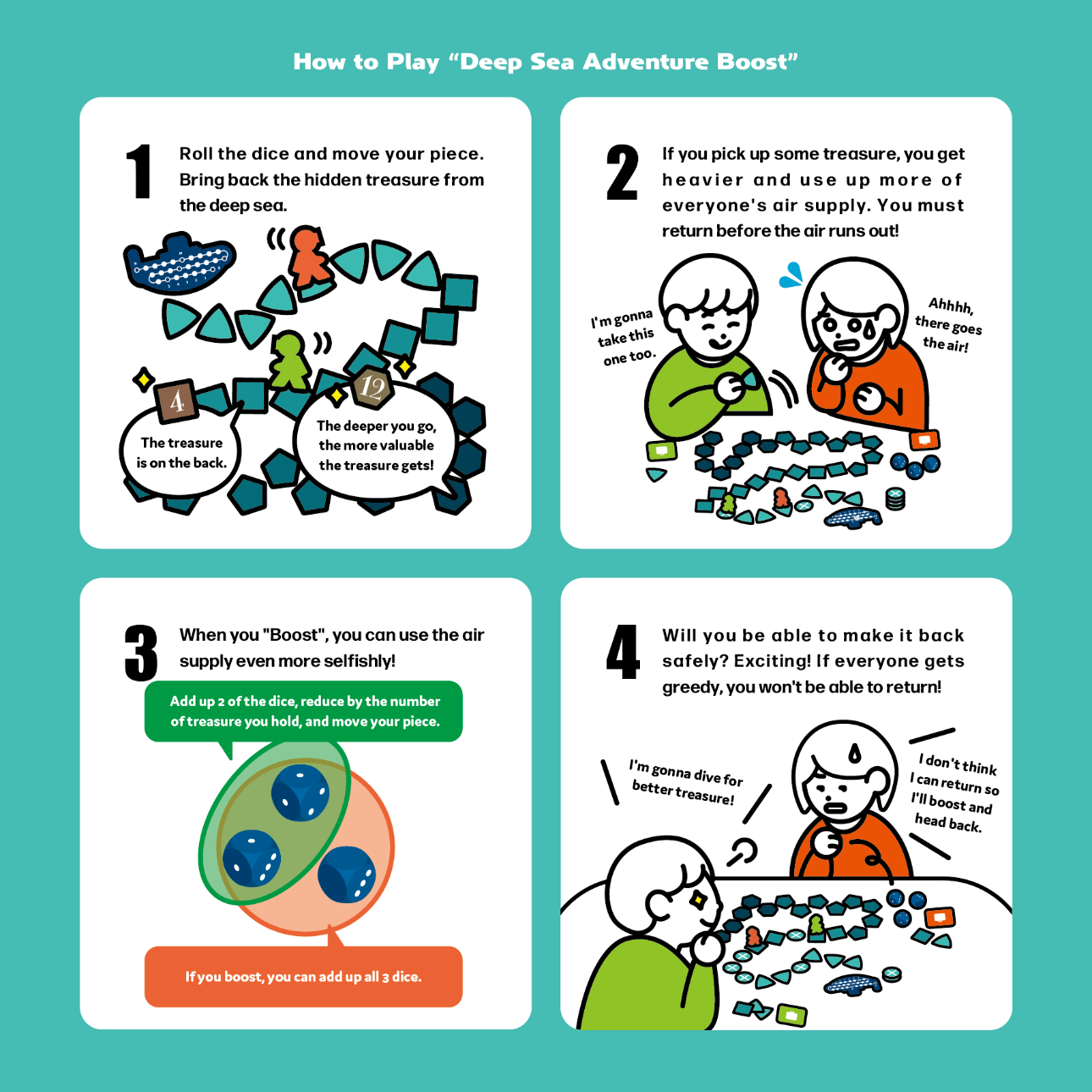 In this powered-up Deep Sea Adventure, players roll 3 dice, boost and move their pieces deeper into the sea, trying to return safely with more treasure than anyone else. Greedy explorers are riding in a submarine together, searching for treasure in the deep sea. With their diving suits on, and brand new boost capability, the explorers eagerly begin their search for treasure. However, their beat-up submarine has only a single air tank for which they all must share. All it takes is one reckless explorer to endanger the lives of everyone else. Can the explorers make it back safely to the submarine with their lives and treasure intact?