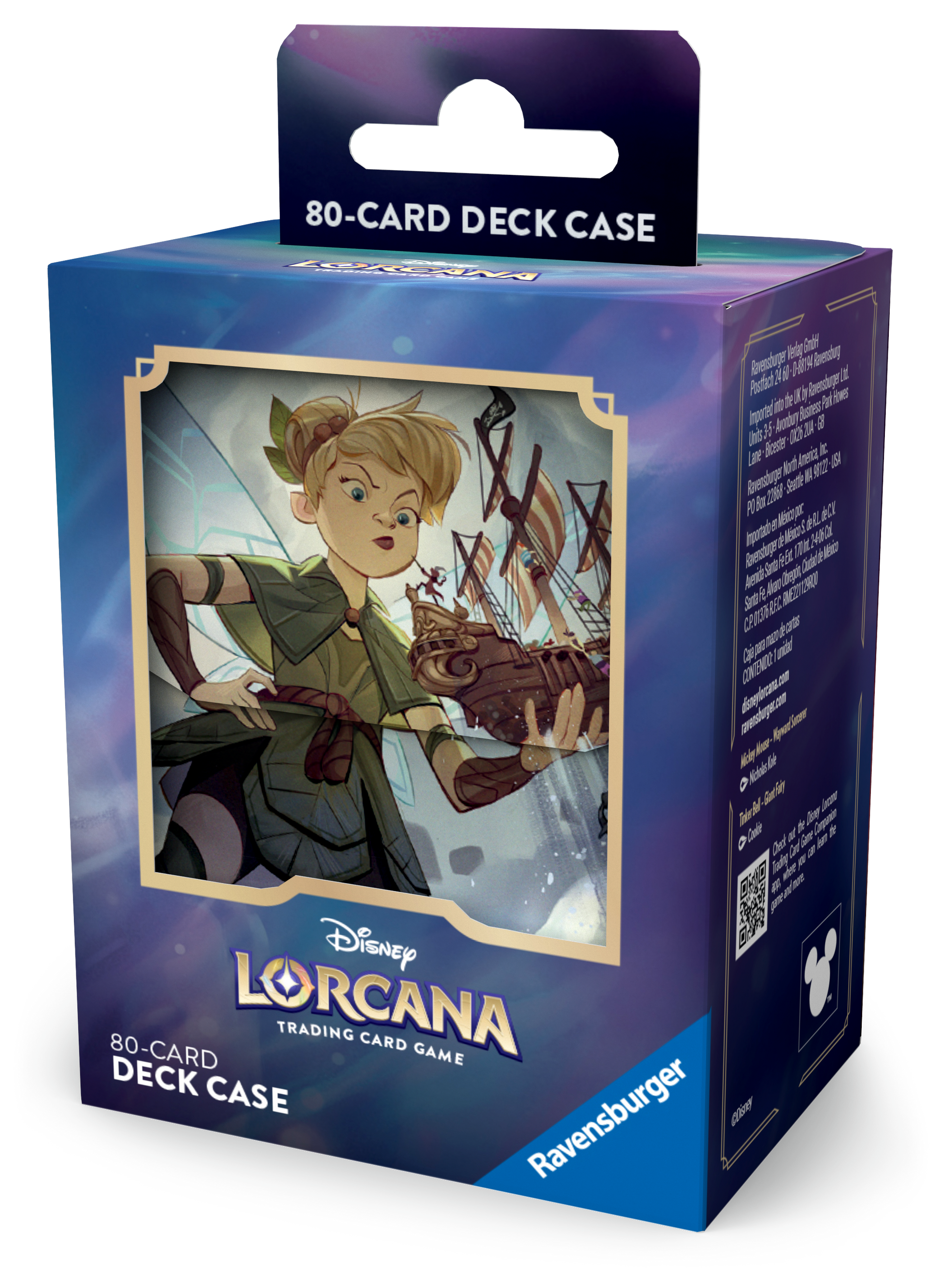 Keep decks organized and protected with Deck Cases featuring card art of Mickey Mouse –Wayward Sorcerer and Enchanted card art of Tinker Bell –Giant Fairy. Each Deck Case can hold up to 80 sleeved cards.