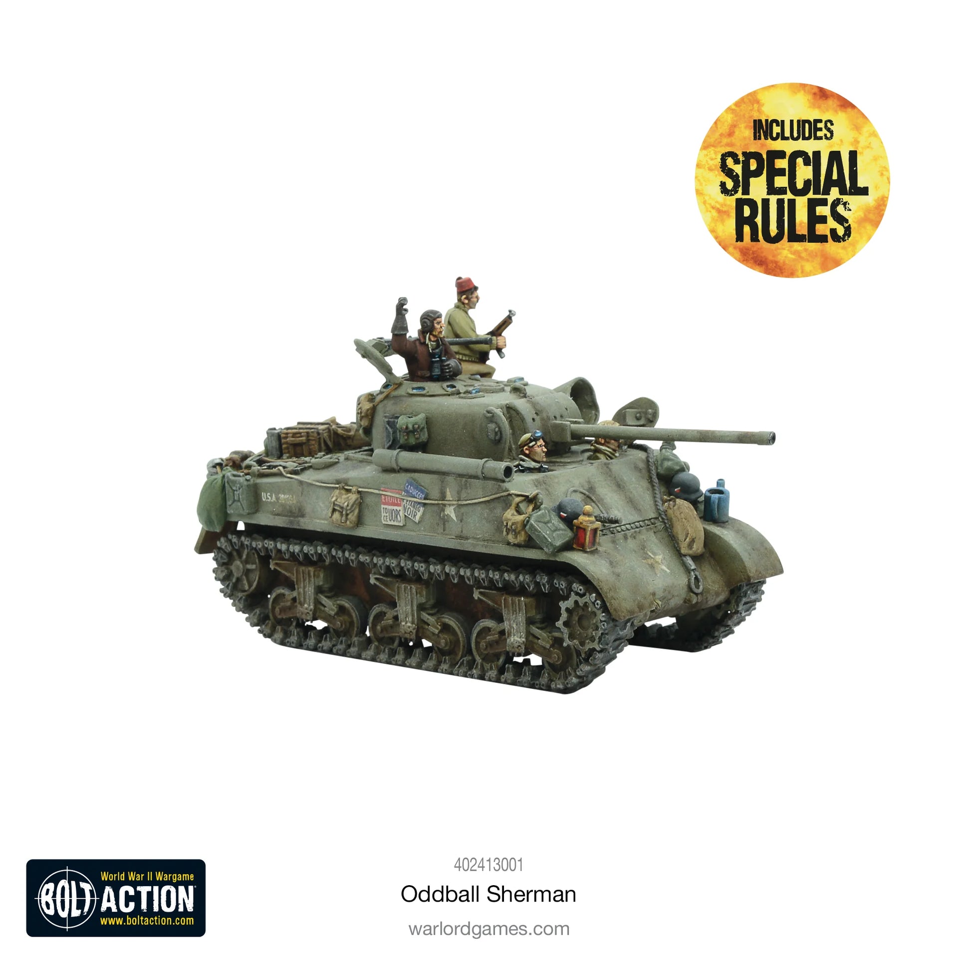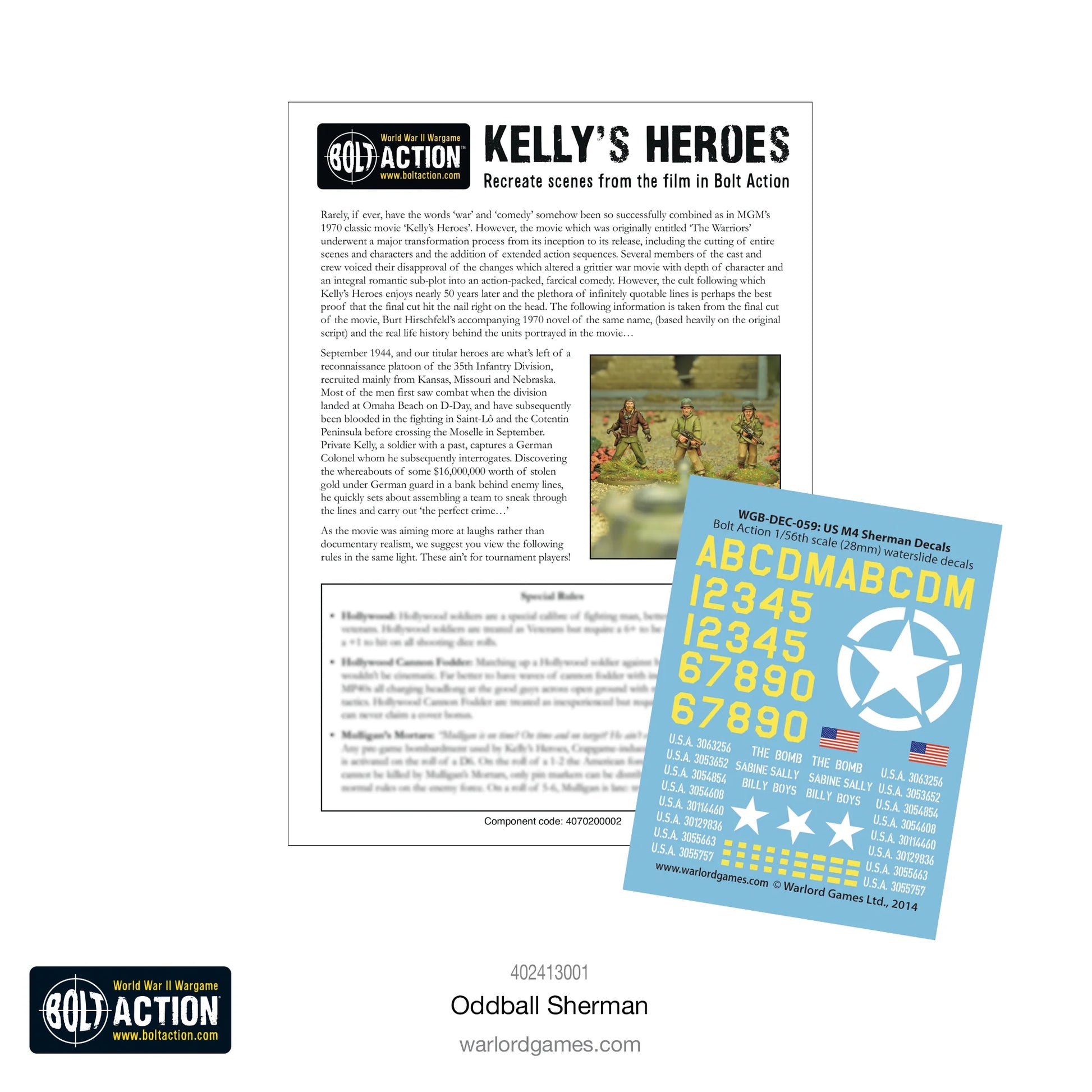There's a superb bonus within every box of Oddball Sherman! A full colour, 8 page, booklet provides every hero and vehicle with their own personalised themed special rules to add that 'Hollywood'flair and daring to your movie inspired games of Bolt Action.