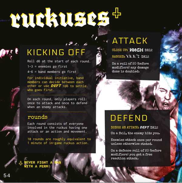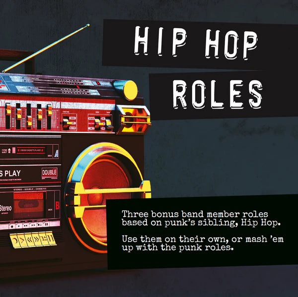 During your adventures, players also compose songs (including music if instruments are available). You don't need to be able to play instruments to play Punk is Dead! Writing songs earns you Individual AND Band Creativity Points, which you can use to turn failure into creative success. There's also a bunch of rollable tables for inspiration. We have a gorgeous songwriting journal available in some pledges and as an add-on.