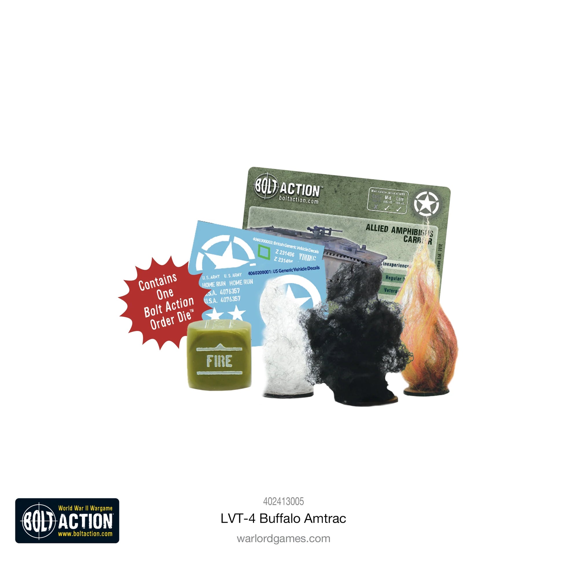 Box contains one resin and metal LVT-4 Buffalo Amtrac, order dice, waterslide decals and game accessories.