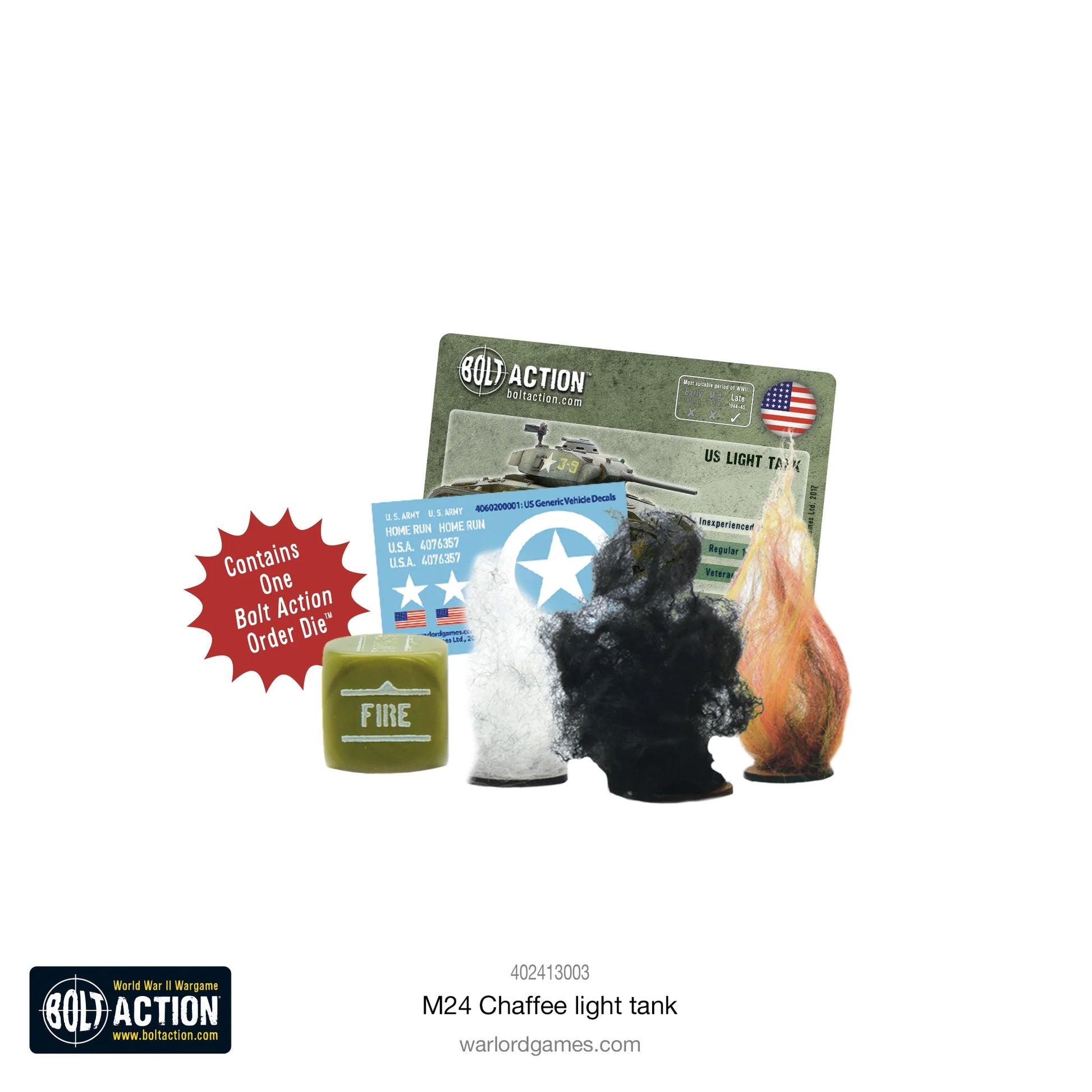 Box contains one resin and metal M24 Chaffee light tank, order dice, waterslide decals and game accessories.